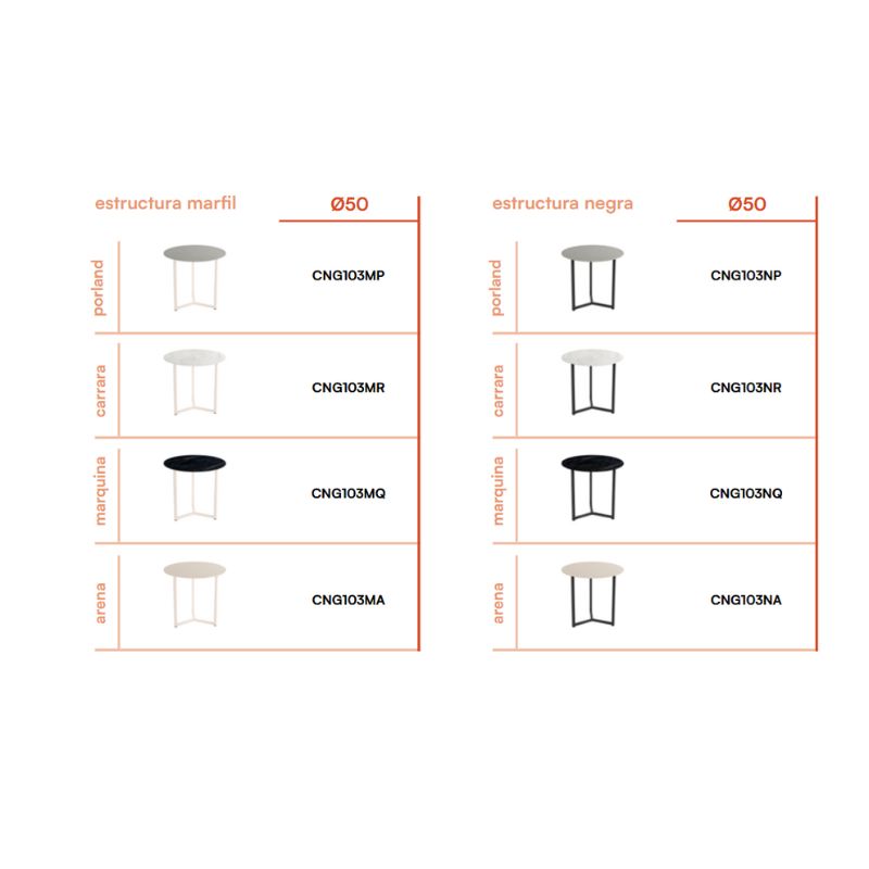 Su estructura metálica, disponible en elegante color marfil o negro, aporta solidez y estabilidad, mientras que el sobre porcelánico de 12 mm con acabado piedra natural ofrece una superficie resistente, sofisticada y fácil de mantener. Este material no solo es visualmente impactante, sino también altamente duradero: soporta el calor, los arañazos y las manchas, lo que la convierte en una elección perfecta para el uso diario.